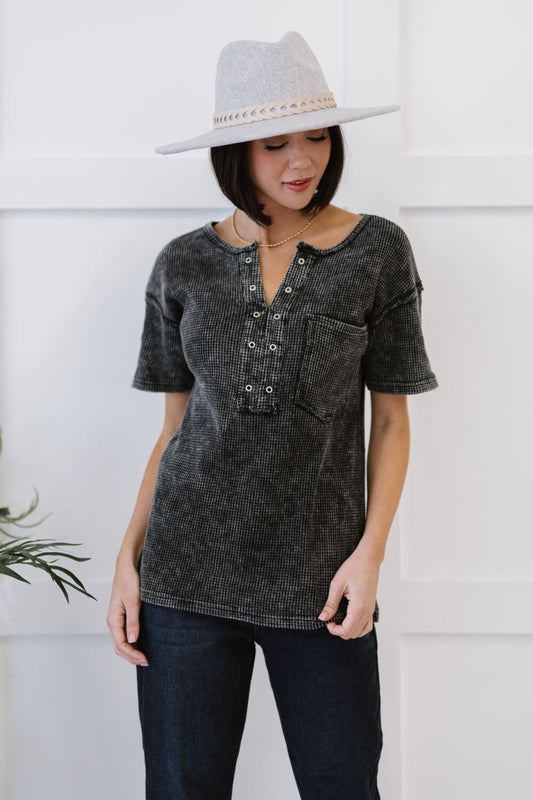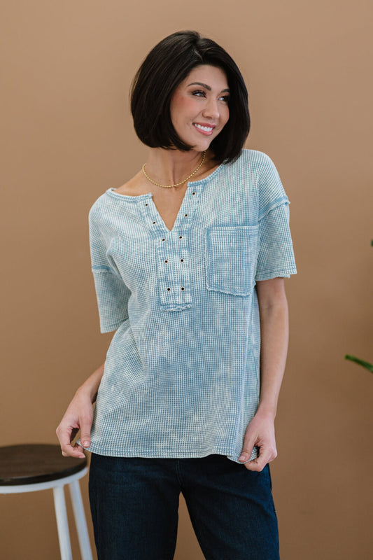 BiBi Notched Popcorn Waffle Long Sleeve Top