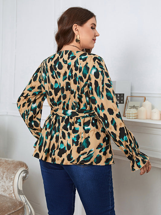 Plus Size Printed Tie Waist Flounce Sleeve Blouse