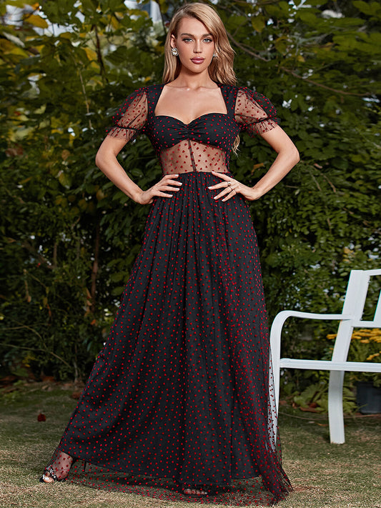 Printed Spliced Mesh Zip-Back Maxi Dress