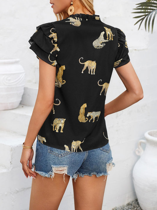 Ruffled Printed Tie Neck Short Sleeve Blouse