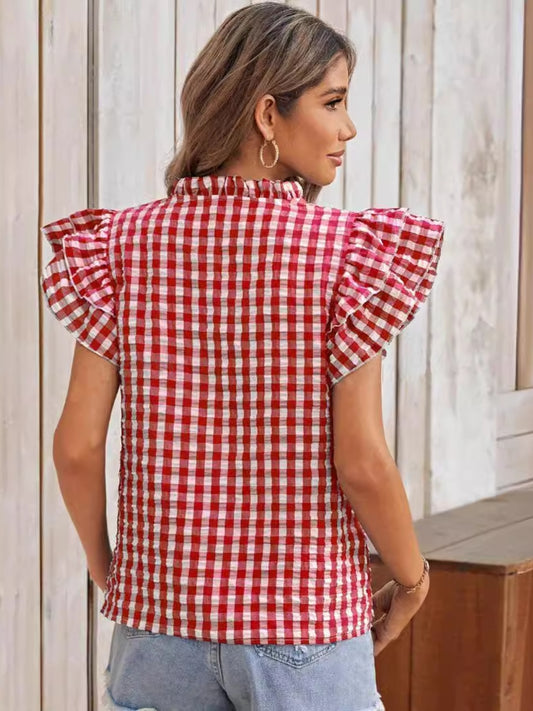 Ruffled Plaid Notched Cap Sleeve Blouse