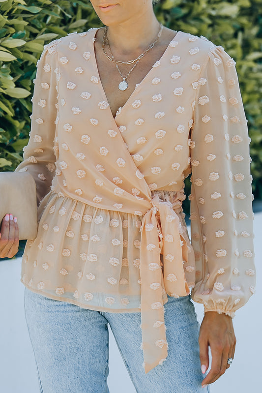 Swiss Dot Tie-Waist Surplice Peplum Blouse