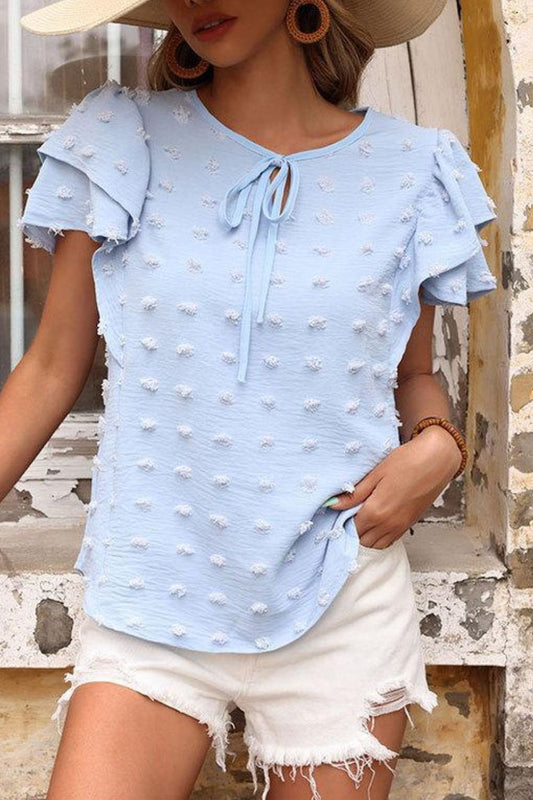 Swiss Dot V-Neck Flounce Sleeve Blouse