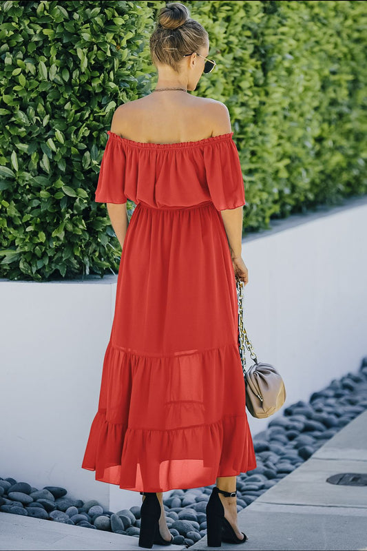 Tie Front Off-Shoulder Belted Tiered Maxi Dress