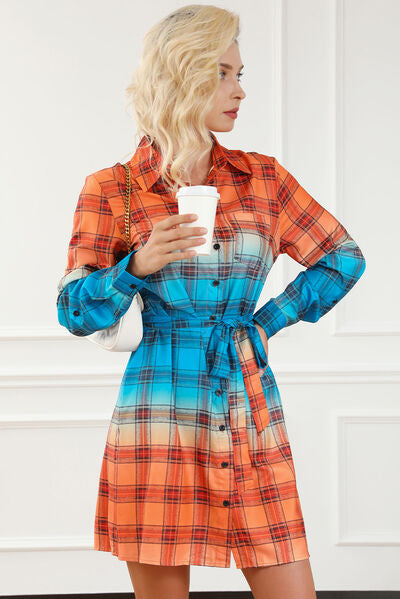 Plus Size Plaid V-Neck Balloon Sleeve Mini Dress