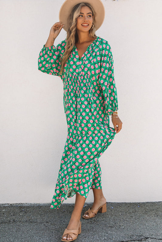 Floral Tie Neck Tiered Long Sleeve Maxi Dress