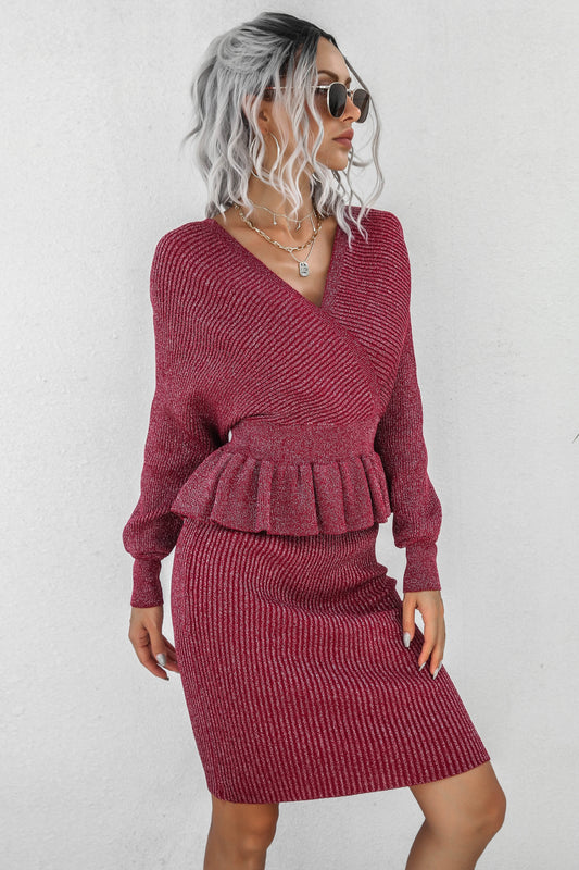 Peplum Dolman Sleeve Rib-Knit Top and Skirt Set