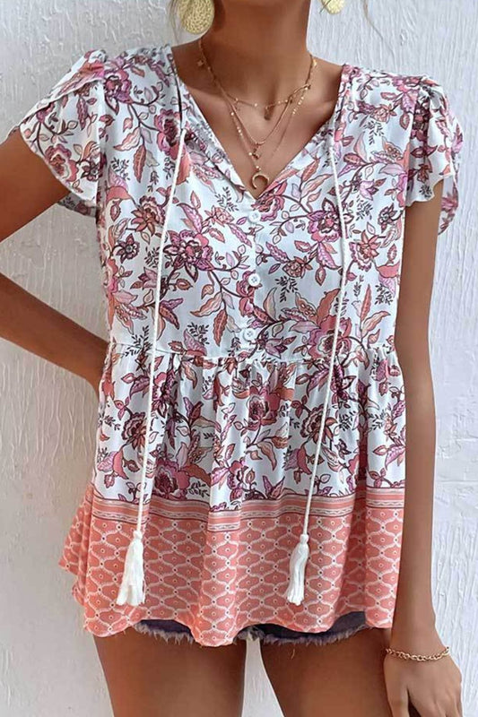 Mixed Print Half Button Petal Sleeve Babydoll Blouse