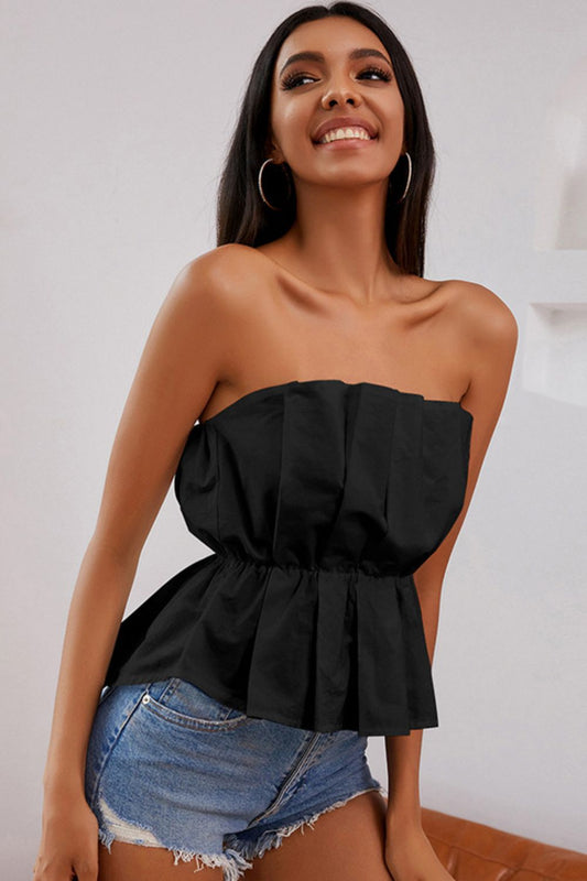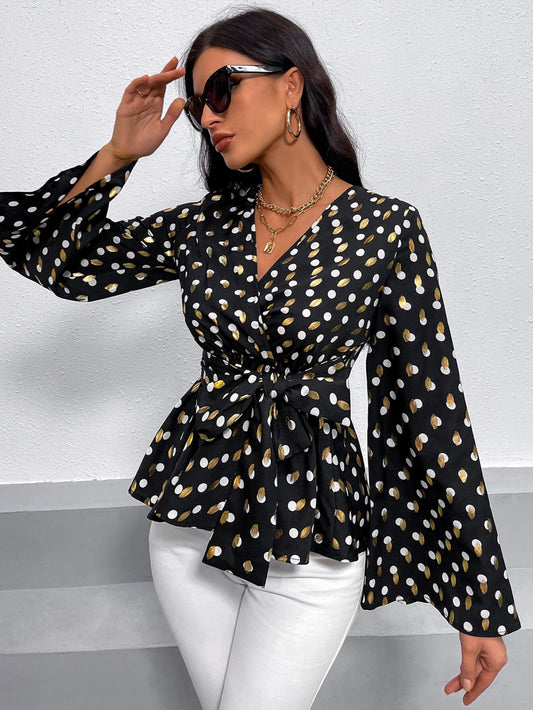 Swiss Dot Drawstring Detail Flare Sleeve Peplum Top