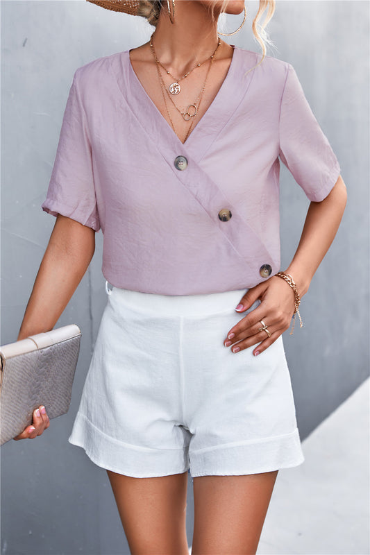 Swiss Dot Ruched V-Neck Babydoll Blouse