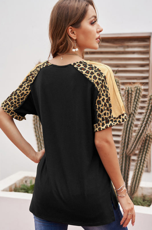 Leopard Print Color Block Sleeves Tunic Top