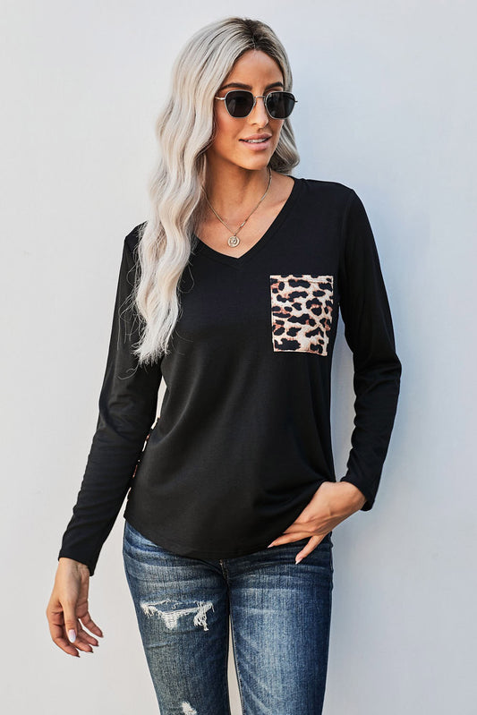 Contrast Leopard V-Neck Pocket Blouse