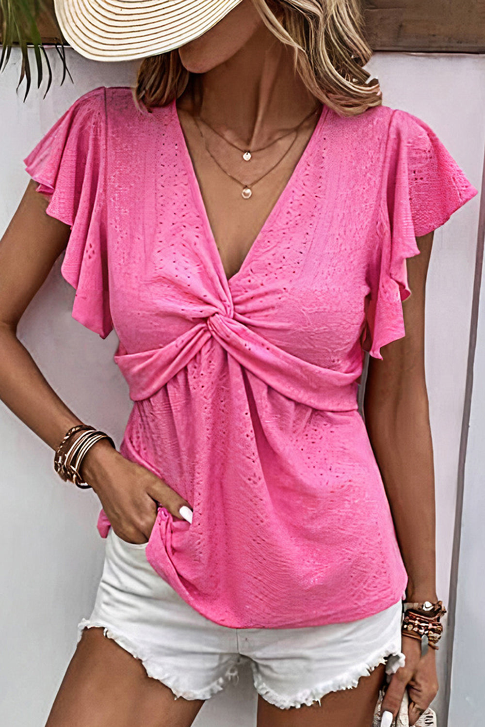 Eyelet Twisted V-Neck Flutter Sleeve Blouse