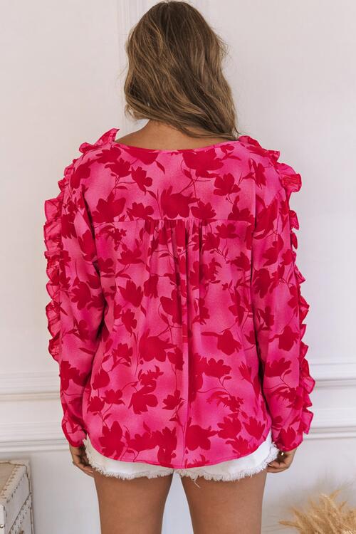 Floral Tie Neck Ruffle Trim Blouse
