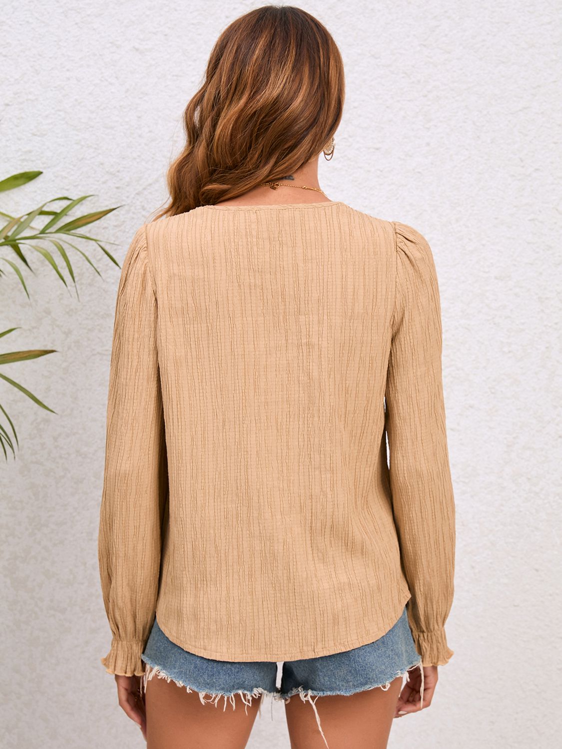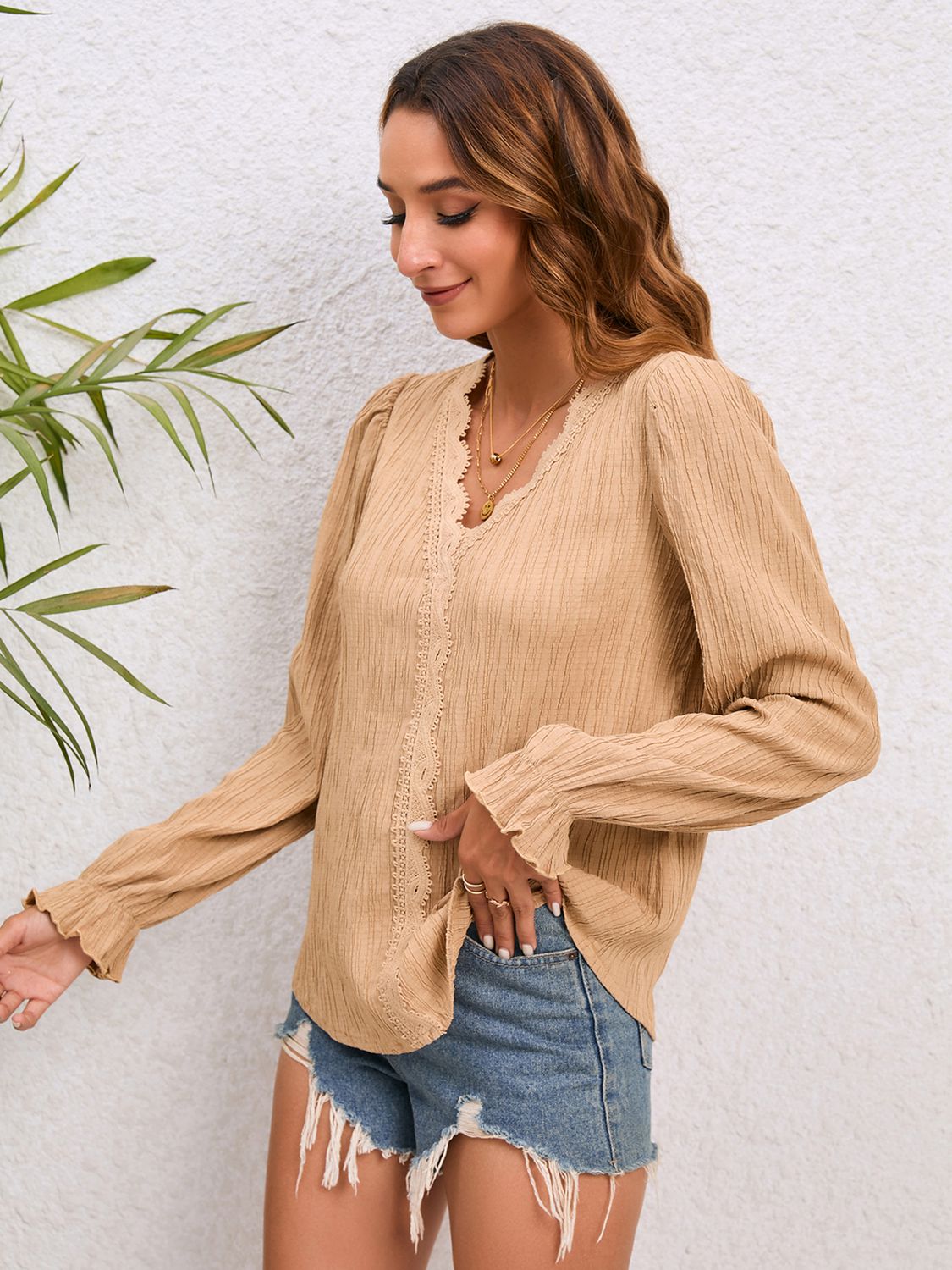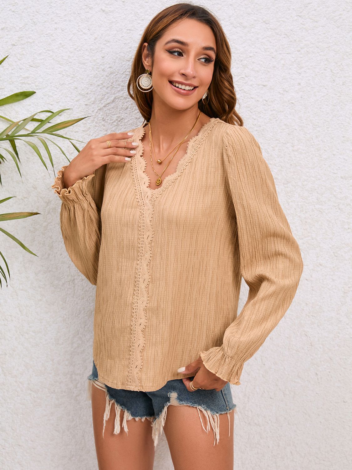 Lace Trim V-Neck Flounce Sleeve Blouse