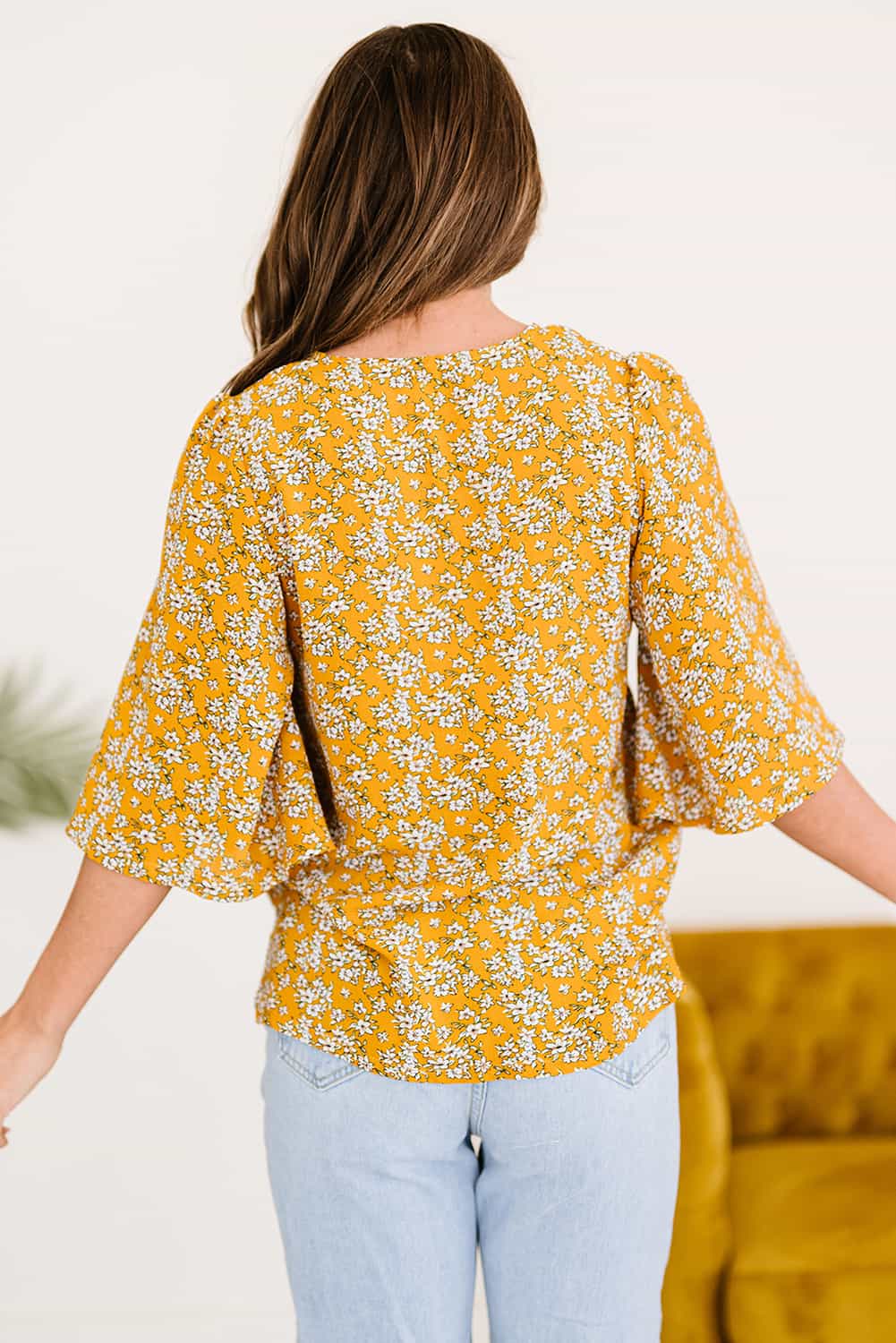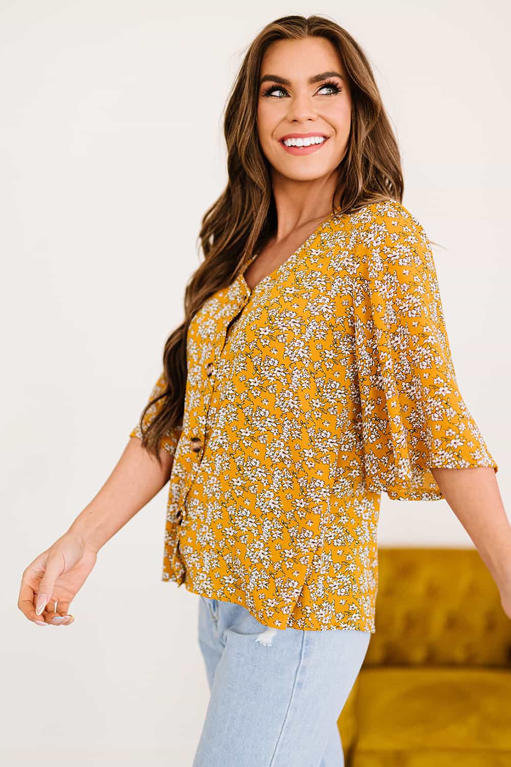 Printed Button Front Flare Sleeve Blouse